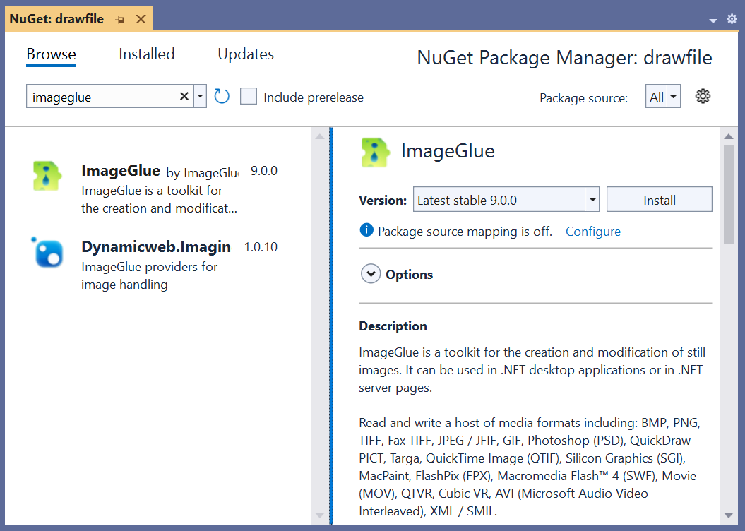 If you cannot see ABCpdf after referencing these packages then check that your Build Target is .NET 8.0 and not one of the .NET Core variants. You can mix and match the full MSI installer with the NuGet packages. If you reference a different NuGet version in your project then that version, rather than the MSI installed version, is the one that will be used. Be careful as it can be confusing if you have multiple different versions of ImageGlue in use. If you are not using Visual Studio, you will need to consult the documentation for your chosen development environment. |
