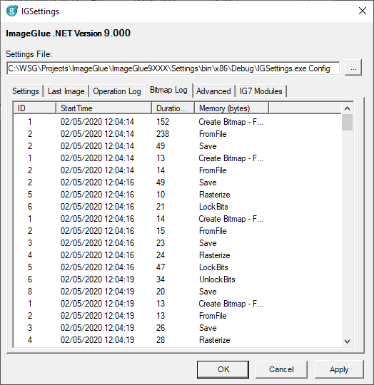 The Bitmap Log tab shows information on bitmap lifetime. This information is derived from the Bitmap Log File. If no log file is available then no information will be shown.