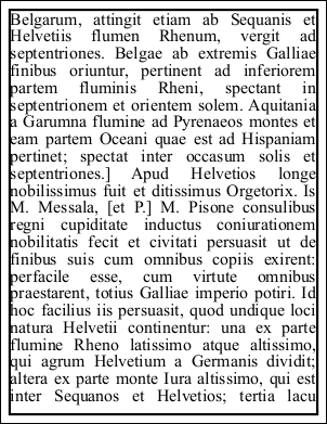 Dim theText As String = "Gallia est omnis divisa in partes tres, quarum unam incolunt Belgae, aliam Aquitani, tertiam qui ipsorum lingua Celtae, nostra Galli appellantur. Hi omnes lingua, institutis, legibus inter se differunt. Gallos ab Aquitanis Garumna flumen, a Belgis Matrona et Sequana dividit. Horum omnium fortissimi sunt Belgae, propterea quod a cultu atque humanitate provinciae longissime absunt, minimeque ad eos mercatores saepe commeant atque ea quae ad effeminandos animos pertinent important, proximique sunt Germanis, qui trans Rhenum incolunt, quibuscum continenter bellum gerunt. Qua de causa Helvetii quoque reliquos Gallos virtute praecedunt, quod fere cotidianis proeliis cum Germanis contendunt, cum aut suis finibus eos prohibent aut ipsi in eorum finibus bellum gerunt. [Eorum una, pars, quam Gallos obtinere dictum est, initium capit a flumine Rhodano, continetur Garumna flumine, Oceano, finibus Belgarum, attingit etiam ab Sequanis et Helvetiis flumen Rhenum, vergit ad septentriones. Belgae ab extremis Galliae finibus oriuntur, pertinent ad inferiorem partem fluminis Rheni, spectant in septentrionem et orientem solem. Aquitania a Garumna flumine ad Pyrenaeos montes et eam partem Oceani quae est ad Hispaniam pertinet; spectat inter occasum solis et septentriones.] Apud Helvetios longe nobilissimus fuit et ditissimus Orgetorix. Is M. Messala, [et P.] M. Pisone consulibus regni cupiditate inductus coniurationem nobilitatis fecit et civitati persuasit ut de finibus suis cum omnibus copiis exirent: perfacile esse, cum virtute omnibus praestarent, totius Galliae imperio potiri. Id hoc facilius iis persuasit, quod undique loci natura Helvetii continentur: una ex parte flumine Rheno latissimo atque altissimo, qui agrum Helvetium a Germanis dividit; altera ex parte monte Iura altissimo, qui est inter Sequanos et Helvetios; tertia lacu Lemanno et flumine Rhodano, qui provinciam nostram ab Helvetiis dividit. His rebus fiebat ut et minus late vagarentur et minus facile finitimis bellum inferre possent; qua ex parte homines bellandi cupidi magno dolore adficiebantur. Pro multitudine autem hominum et pro gloria belli atque fortitudinis angustos se fines habere arbitrabantur, qui in longitudinem milia passuum CCXL, in latitudinem CLXXX patebant."