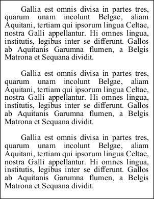 Dim theText As String = "Gallia est omnis divisa in partes tres, quarum unam incolunt Belgae, aliam Aquitani, tertiam qui ipsorum lingua Celtae, nostra Galli appellantur. Hi omnes lingua, institutis, legibus inter se differunt. Gallos ab Aquitanis Garumna flumen, a Belgis Matrona et Sequana dividit."