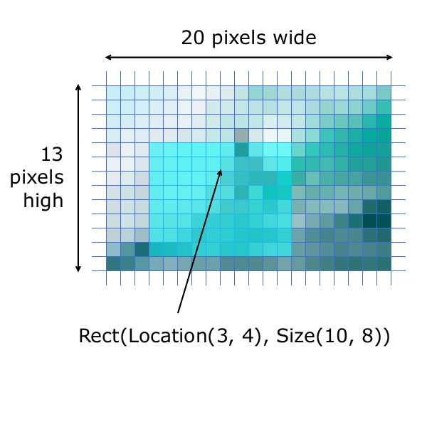 As well as specifying Points on your Bitmap you often need to specify areas. One of the most common constructs is a Rectangle. You can use a rectangle to specify an area of the Bitmap. For instance:
