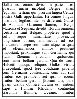 Dim theText As String = "Gallia est omnis divisa in partes tres, quarum unam incolunt Belgae, aliam Aquitani, tertiam qui ipsorum lingua Celtae, nostra Galli appellantur. Hi omnes lingua, institutis, legibus inter se differunt. Gallos ab Aquitanis Garumna flumen, a Belgis Matrona et Sequana dividit. Horum omnium fortissimi sunt Belgae, propterea quod a cultu atque humanitate provinciae longissime absunt, minimeque ad eos mercatores saepe commeant atque ea quae ad effeminandos animos pertinent important, proximique sunt Germanis, qui trans Rhenum incolunt, quibuscum continenter bellum gerunt. Qua de causa Helvetii quoque reliquos Gallos virtute praecedunt, quod fere cotidianis proeliis cum Germanis contendunt, cum aut suis finibus eos prohibent aut ipsi in eorum finibus bellum gerunt. [Eorum una, pars, quam Gallos obtinere dictum est, initium capit a flumine Rhodano, continetur Garumna flumine, Oceano, finibus Belgarum, attingit etiam ab Sequanis et Helvetiis flumen Rhenum, vergit ad septentriones. Belgae ab extremis Galliae finibus oriuntur, pertinent ad inferiorem partem fluminis Rheni, spectant in septentrionem et orientem solem. Aquitania a Garumna flumine ad Pyrenaeos montes et eam partem Oceani quae est ad Hispaniam pertinet; spectat inter occasum solis et septentriones.] Apud Helvetios longe nobilissimus fuit et ditissimus Orgetorix. Is M. Messala, [et P.] M. Pisone consulibus regni cupiditate inductus coniurationem nobilitatis fecit et civitati persuasit ut de finibus suis cum omnibus copiis exirent: perfacile esse, cum virtute omnibus praestarent, totius Galliae imperio potiri. Id hoc facilius iis persuasit, quod undique loci natura Helvetii continentur: una ex parte flumine Rheno latissimo atque altissimo, qui agrum Helvetium a Germanis dividit; altera ex parte monte Iura altissimo, qui est inter Sequanos et Helvetios; tertia lacu Lemanno et flumine Rhodano, qui provinciam nostram ab Helvetiis dividit. His rebus fiebat ut et minus late vagarentur et minus facile finitimis bellum inferre possent; qua ex parte homines bellandi cupidi magno dolore adficiebantur. Pro multitudine autem hominum et pro gloria belli atque fortitudinis angustos se fines habere arbitrabantur, qui in longitudinem milia passuum CCXL, in latitudinem CLXXX patebant."
